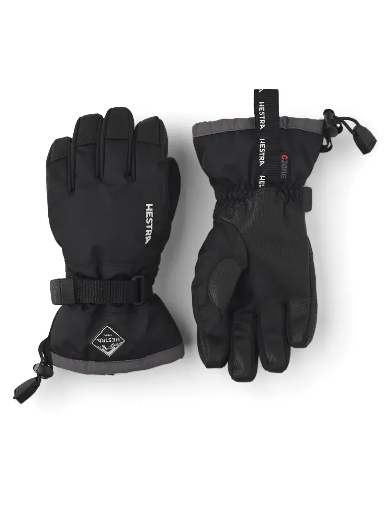 vinterhandske för barn Varm och skön barnhandske för skidåkning, lek och uteliv i kallt vinterväder. En av Hestras mest populära juniormodeller, sydd i tålig polyester med vattentätt och ventilerande CZone-membran och längre krage som håller snön på utsidan. Fingertoppar och handflata är förstärkta med PU-belagd syntetväv för extra slitstyrka och grepp runt stavar, pulkahandtag och andra vinterprylar. Insidan är i fleece och handsken har värmande syntetfyllning i polyester. Finns även i tum- och 3-fingermodell