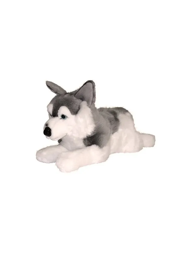 Liggande mjukishusky. Mjuk plysch i grått och vitt. Mjuk nos i skinnimitation, broderad mun, hårda plastögon med svart pupill och isblå iris. Mycket fin kvalitet som ökar tack vare att den i tassar och bakparti har en extra fyllning av slappomaterial för att ge djuret extra stabilitet och kvalitetskänsla.