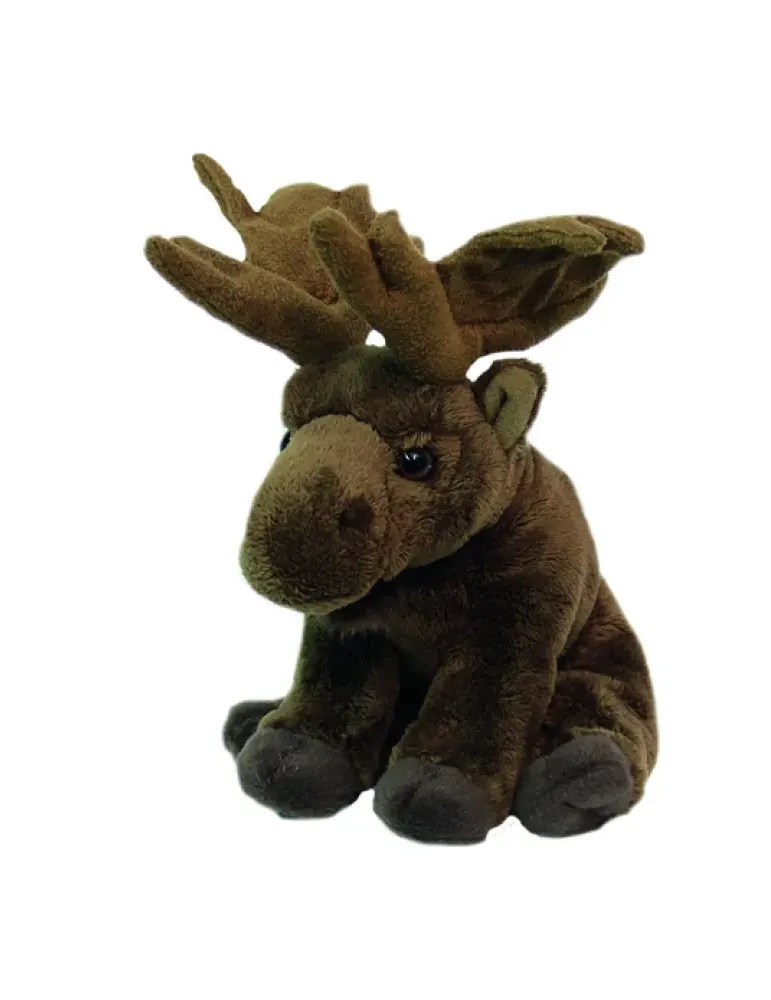 Mörkbrun mjukdjursälg i kort len plysch och med detaljsydda horn. Stora knappnålsögon med djup där pupillen är svart och iris mörkbrun