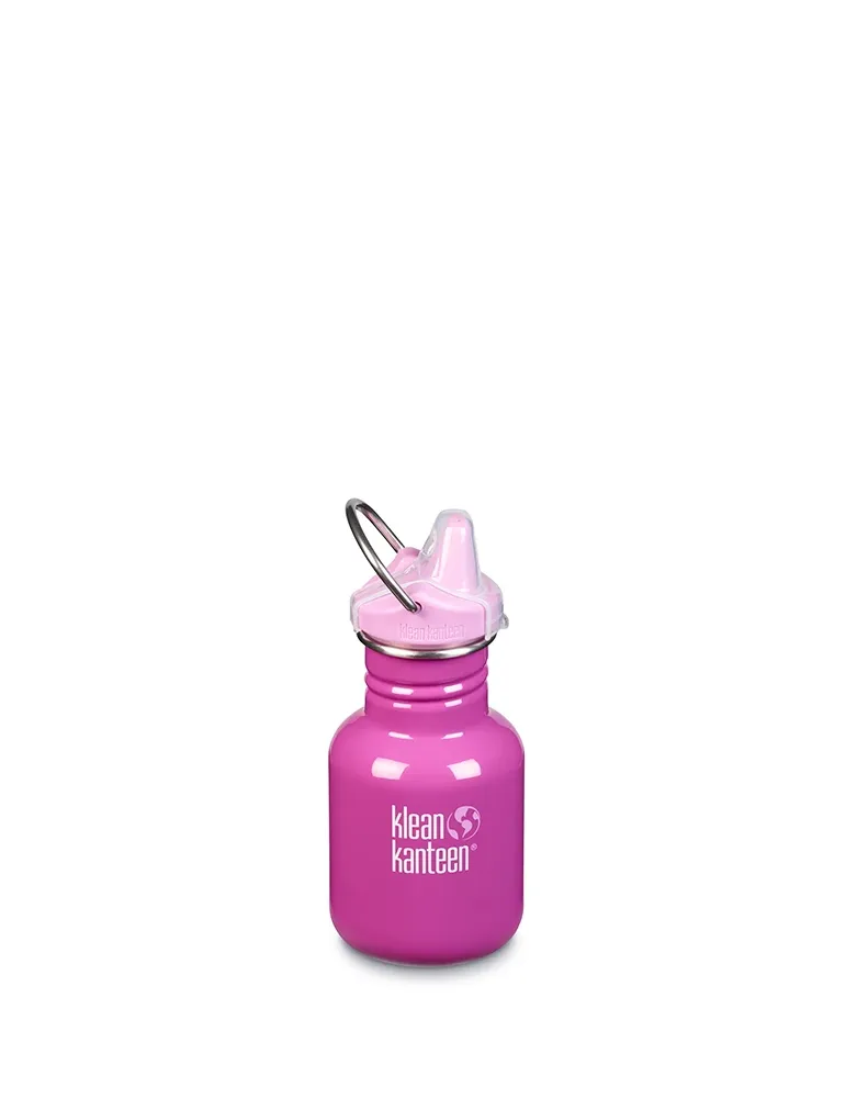Barnvänlig flaska i rostfritt stål från Klean Kanteen med praktisk pipmuggskork för små händer.