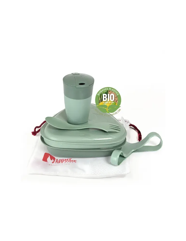 Allt du behöver för att förbereda och äta en måltid utomhus. Messkit BIO är designad speciellt för Light My Fire av den skandinaviska designern Joachim Nordwall och är ett praktiskt allt-i-ett måltidssats. Satsen innehåller 1 lock som fungerar som en tallrik (500 ml), 1 djupbotten skål som också fungerar som en tallrik (900 ml), 1 Pack-up-Cup (260 ml) och 1 Light My Fire Spork Original. Den inkluderar också en rem för att hålla satsen ihop. Pack-up-cupen expanderar när du är redo för en varm eller kall dryck och kollapsar när måltiden är över och när middagen är klar, använd tallriken och skålen för att äta en läcker måltid med Spork-originalet som är en kombisked- gaffel-kniv. Det fina med detta kit är att det hela häckar inuti sig själv för ett kompakt och mångsidigt produkt. Slutligen är alla komponenter tåliga för diskmaskin och mikrovågsugn (utom Pack-up-Cup) och är tillverkade av biobaserad plast som är 100% BPA-fri. Detta gör satsen mångsidig att använda som lunchlåda för skolan eller arbetet.