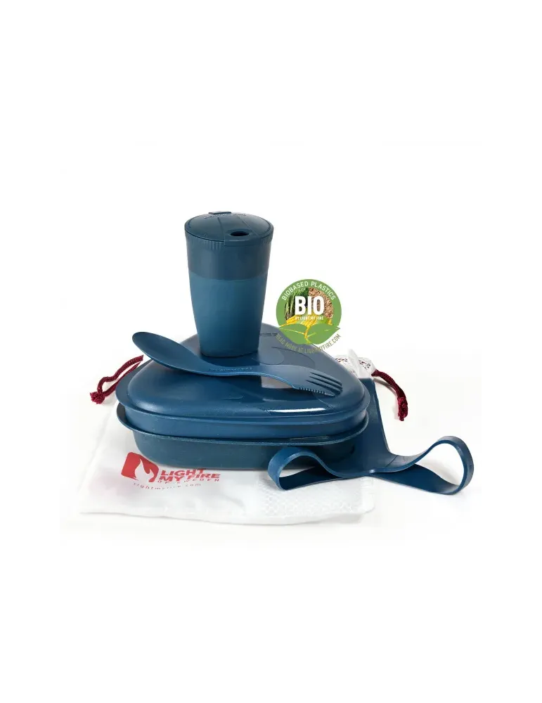 Allt du behöver för att förbereda och äta en måltid utomhus. Messkit BIO är designad speciellt för Light My Fire av den skandinaviska designern Joachim Nordwall och är ett praktiskt allt-i-ett måltidssats. Satsen innehåller 1 lock som fungerar som en tallrik (500 ml), 1 djupbotten skål som också fungerar som en tallrik (900 ml), 1 Pack-up-Cup (260 ml) och 1 Light My Fire Spork Original. Den inkluderar också en rem för att hålla satsen ihop. Pack-up-cupen expanderar när du är redo för en varm eller kall dryck och kollapsar när måltiden är över och när middagen är klar, använd tallriken och skålen för att äta en läcker måltid med Spork-originalet som är en kombisked- gaffel-kniv. Det fina med detta kit är att det hela häckar inuti sig själv för ett kompakt och mångsidigt produkt. Slutligen är alla komponenter tåliga för diskmaskin och mikrovågsugn (utom Pack-up-Cup) och är tillverkade av biobaserad plast som är 100% BPA-fri. Detta gör satsen mångsidig att använda som lunchlåda för skolan eller arbetet.