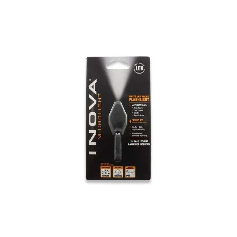 Silver and black impact and water resistant case. Virtually indestructible LED technology. Up to 22 hours of light per battery set. Lithium batteries included. Four function microprocessor switch: high power, low power, strobe, and signal mode. Stainless steel attachment clip. Hang packaged.