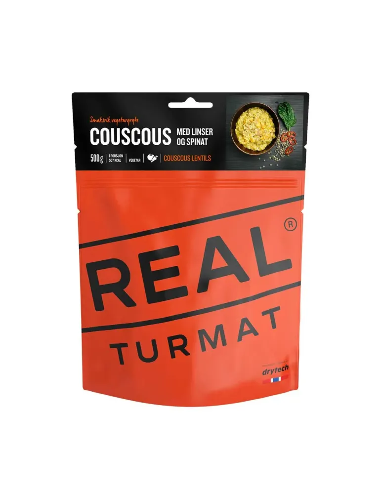 Couscous with Lentils and Spinach är en välsmakande vegetarisk rätt som ingår i Field Meal-sortimentet. Den innehåller en välbalanserad kombination av kolhydrater och protein genom couscous, linser och sojakött, kompletterad med spenat för extra näring. Måltiden tillreds enkelt genom att klippa av påsens topp, tillsätta 5,3 dl vatten till nivåmärket, röra om och låta stå i 8 minuter.