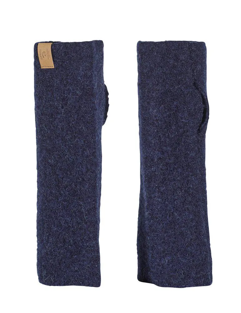 Handledvärmare i filtad försedda med tumgrepp. Tillgängliga i tre färger och i två olika storlekar; S & L. Upptill på vänster värmare sitter ett litet smakfullt logo-märke. Logomärket är framställt av Jacron, ett material som ser ut som läder, men som faktiskt är ett unikt pappersmaterial.