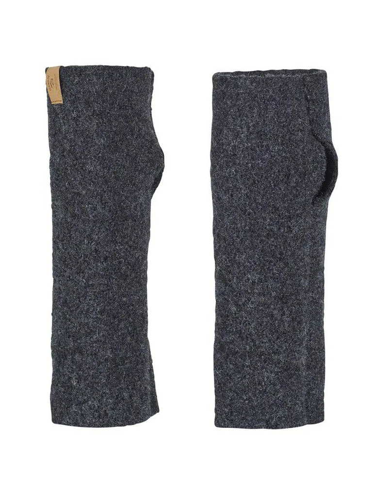 Handledvärmare i filtad försedda med tumgrepp. Tillgängliga i tre färger och i två olika storlekar; S & L. Upptill på vänster värmare sitter ett litet smakfullt logo-märke. Logomärket är framställt av Jacron, ett material som ser ut som läder, men som faktiskt är ett unikt pappersmaterial.