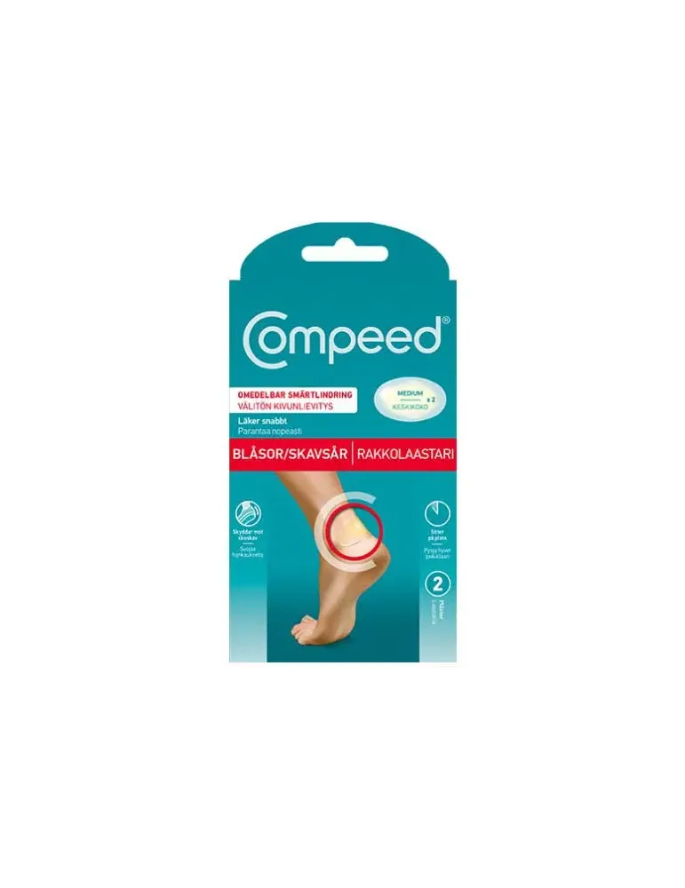 Compeed Skavsårsplåster Medium fungerar som en andra hud på skavsåret. Plåstret lindrar smärtan och skyddar skavsåret. Verkar tryckavlastande och påskyndar läkningsprocessen. Ju tidigare du applicerar plåstret, desto snabbare läker blåsan.
