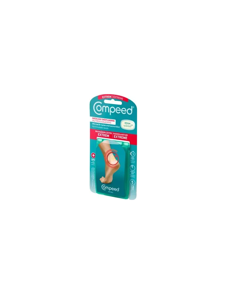 OMPEED® Skavsårsplåster Extrem är utformat för mycket smärtsamma blåsor. Plåstret ger snabb smärtlindring och 20 procent extra tryckavlastning jämfört med COMPEED® Skavsårsplåster Medium. Fungerar som ett andra hudlager, är diskret och vattentätt.