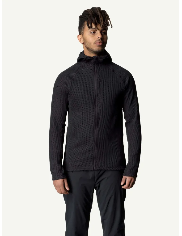 Pace Flow Houdi herr är tillverkad av Polartec® Power Dry® Mesh, ett lättviktigt nätmaterial som skapar isolering utan att stänga in överflödig värme eller ånga. När du bär den som ett yttre lager låter den luften strömma genom plagget och ventilerar ut överskottsvärme och fukt. När du bär den under ett skallager bildar den ett robust lager av varm luft som ger en exceptionell isolering, särskilt med tanke på den låga vikten.