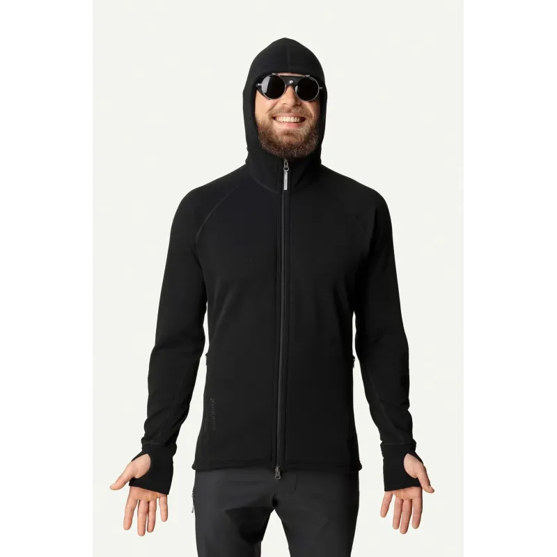 Tröjan är gjord i Polartec Power Stretch Pro, det bästa fleecetyget av sitt slag vi stött på. Det är mjukt, bekvämt och näst intill oförstörbart. Den höga kragen och åtsittande huvan sitter skönt runt nacken och huvudet och de förlängda ärmarna med tumhål håller dina händer varma i kalla grader.