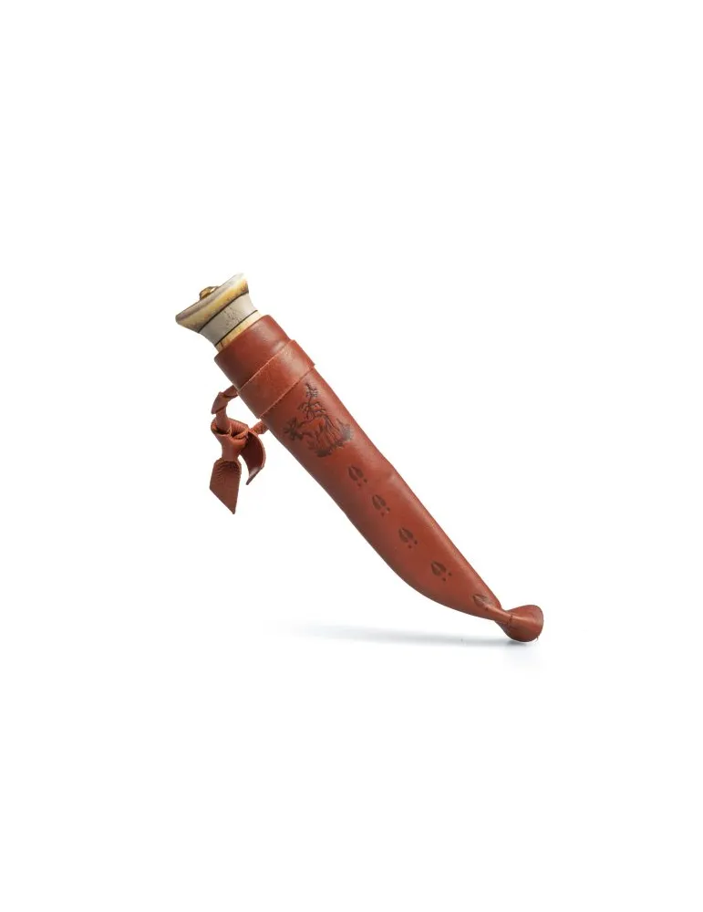 Kniv med handtag av horn och björk i flera färger. Blad 7,7 mm i kolstål.