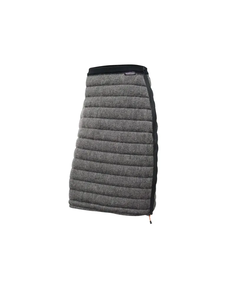En kort och smidig överdragskjol i en unik 3-lagerskvilt, där två lager ull ligger tillsammans med ett högfunktionellt fodertyg.Det filtade ullmaterialet, i 100% ull är stickat i den egen fabriken i Gällstad. Fodertyget är utvecklat för aktiv livsstil och tillverkat av återvunna PET-flaskor. Kjolen är vändbar med en dragkedja längst ena sidan, så du väljer enkelt vilken sida du vill bära mot kroppen, ullen eller det vävda fodertyget. Kvilten har en 60g ullpadding som värmer fantastiskt skönt. Som en fingervisning så mäter storlek 38 45cm i längd. Denna modellen finns även i en längre, Pulsar skirt.