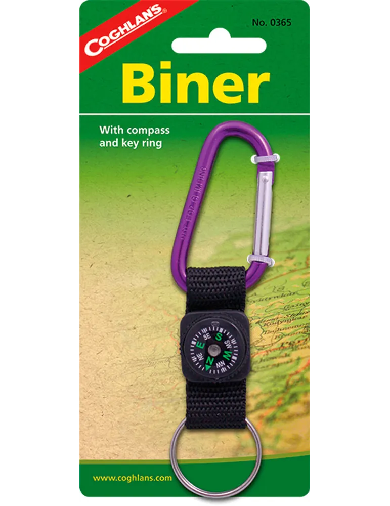 Coghlan's Biner With Compass And Key Ring är en klassisk kabinhake med en mindre kompass fäst på sig.