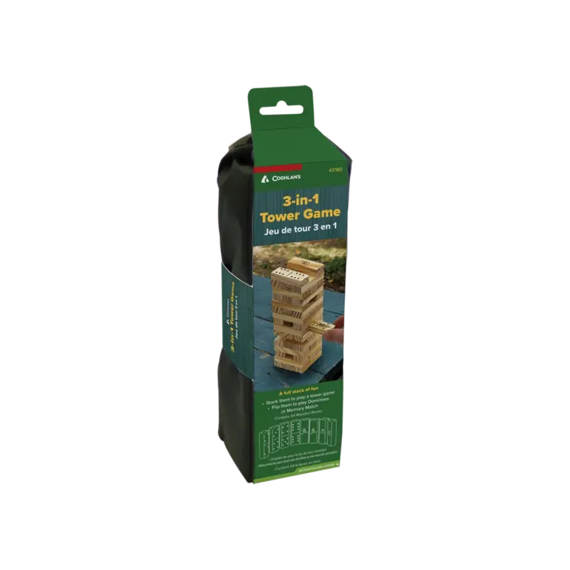 3 In 1 Tower Game från Coghlan's är ett 3-i-1-spel som bygger på det klassiska Jengaspelet. Utöver ett stapelspel kan delarna även användas till att spela både Domino och Memory. Innehåll
