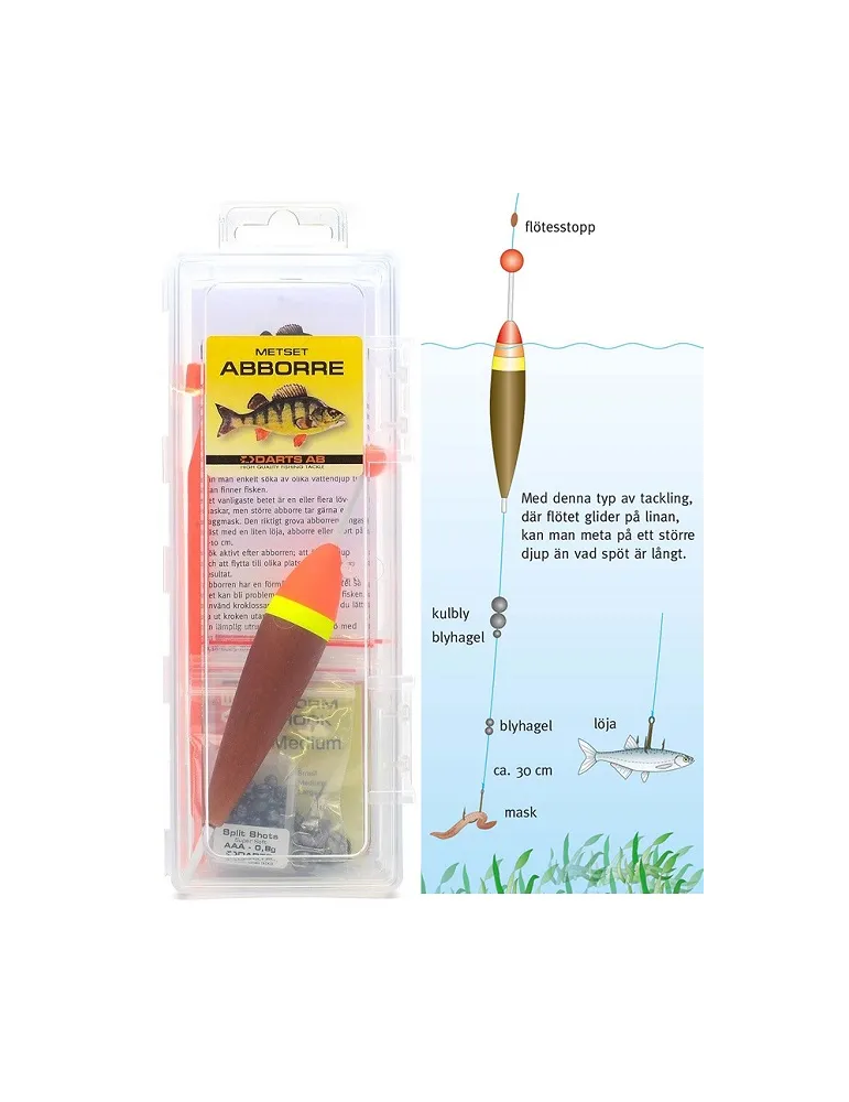 Komplett set för mete efter abborre. innehåller ett glidflöte för fiske på olika djup, flötesstopp, enkel- och trekrok samt erforderliga sänken och en rejäl kroklossare.