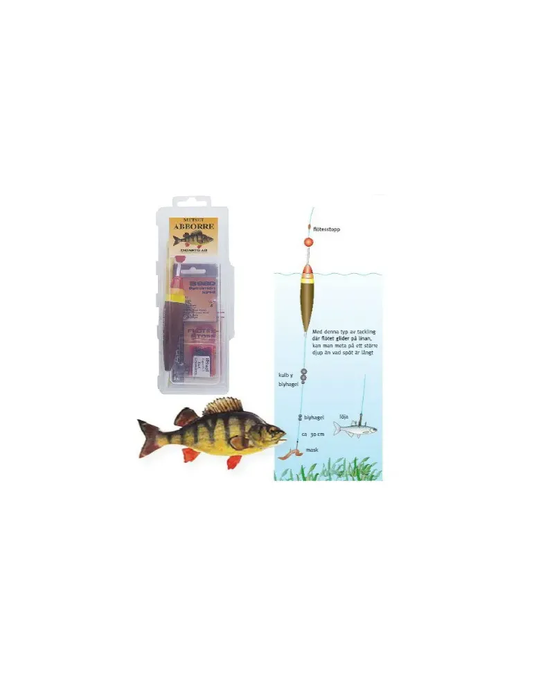 Komplett set för mete efter abborre. innehåller ett glidflöte för fiske på olika djup, flötesstopp, enkel- och trekrok samt erforderliga sänken och en rejäl kroklossare.