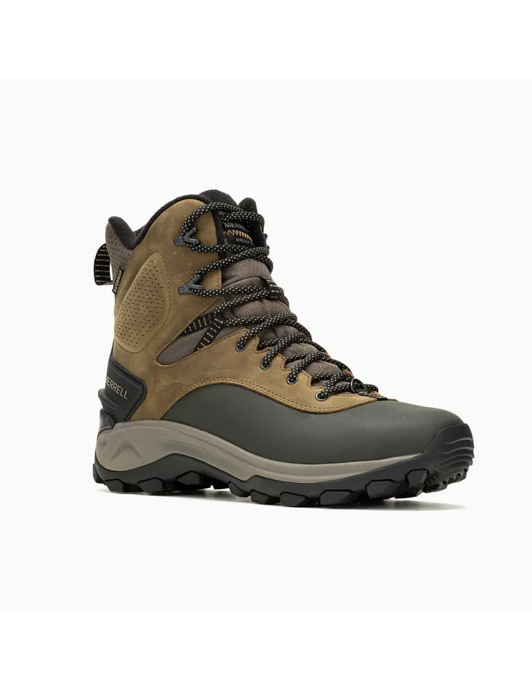 • Waterproof membrane seals out water and lets moisture escape • Protective shell keeps feet dry • Waterproof full grain leather upper • Metal hook and eyelets for added durability • 100% recycled laces and webbing • Bellows tongue keeps out debris • Molded TPU heel counter for security • Gaiter D-Ring • Heel pull tab for easy on and off • 100% recycled fleece lining • 400 grams Primaloft® Gold Eco Series synthetic insulation • 100% recycled mesh footbed cover • Cleansport NXT™ treated for natural odor control • 50% recycled removable EVA foam footbed • Molded nylon arch shank • Merrell Air Cushion in the heel absorbs shock and adds stability • Lightweight EVA foam midsole for stability and comfort • Merrell sticky rubber outsole designed for winter optimizes traction over cold weather surface conditions