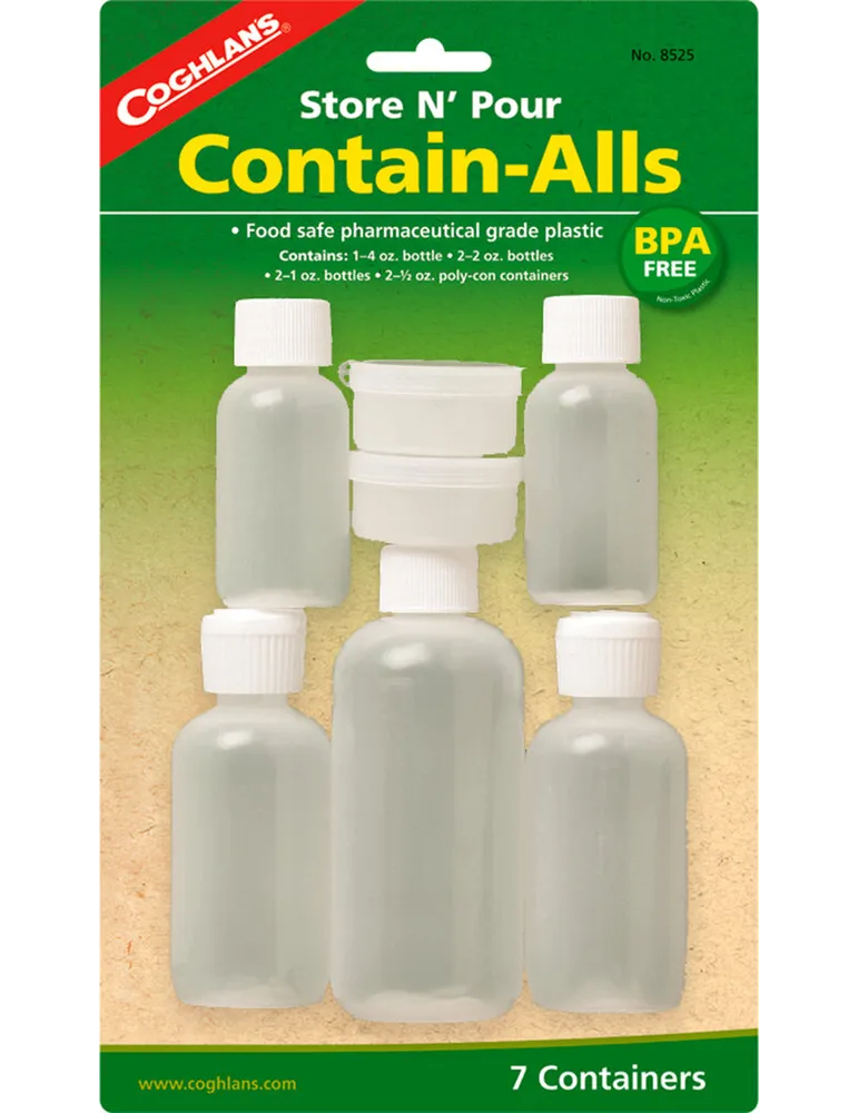 Contain-Alls från Coghlan´s är ett resekit med lätta och flexibla små flaskor och burkar. Lämpliga för exempelvis hygienprodukter, mediciner eller förvaring av kryddor. Samtliga flaskor och burkar är BPA-fira.