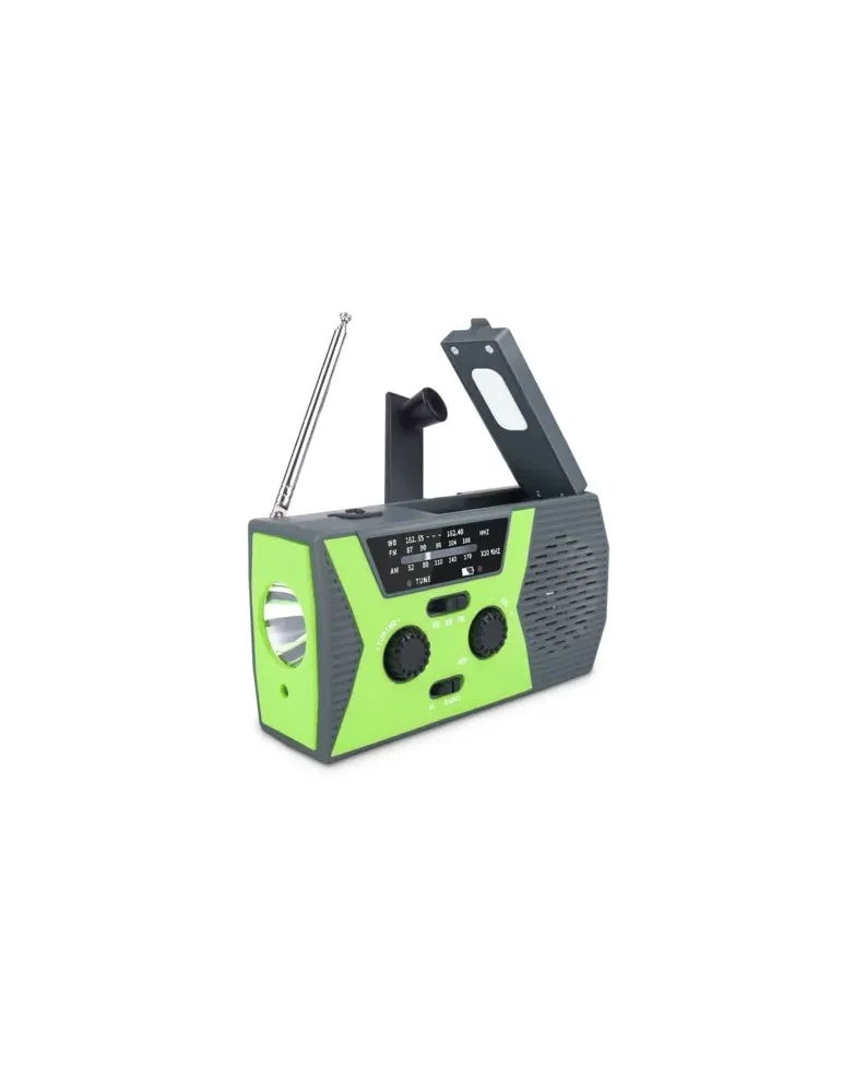 Vevradioradio för utflykter och nödsituationer. Vevradio som nödladdar din mobiltelefon genom USB-A-uttaget (4000 mAh). Laddas med hjälp av vev, solcell eller USB-kabel, typ C. Ficklampa LED (1W/30LM) Vikt: 350 g Mått: ca 143x78 x45 mm Vattentät IPX3 Uttag för hörlurar