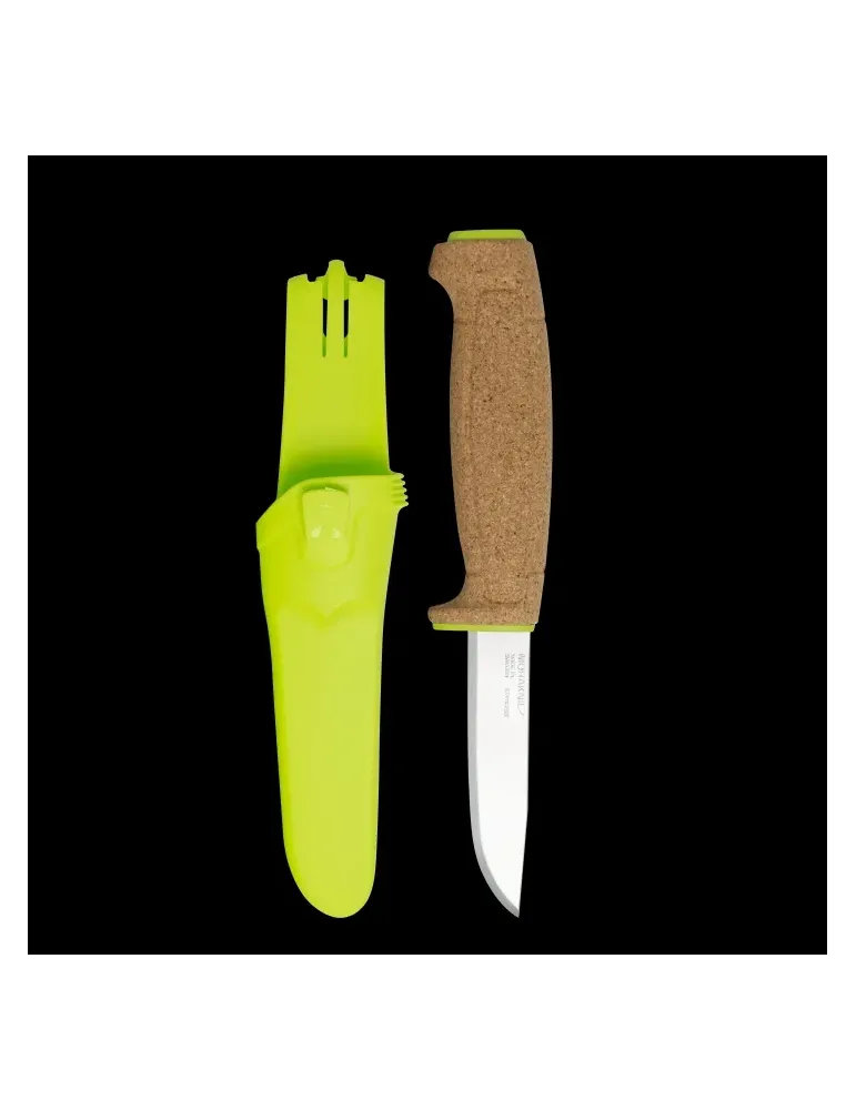 Kniven som flyter med hjälp av sitt naturliga korkhandtag väger endast 49 gram och har ett 1,4 mm tunt blad av rostfritt stål. Den limegröna färgen är väl synlig i vatten vilket gör att du enkelt kan lokalisera och plocka upp din kniv. Tack vare knivslidans bältes-clip fäster du den enkelt i bältet eller på flytvästen. Knivslidan kan även fästas vid dina arbetskläders verktygsknappar och knivslidans knapp ger dessutom möjlighet att fästa ytterligare knivar ur vårt hantverkssortiment vid varandra, så att du fritt kan kombinera ihop de knivar som passar just dig bäst.