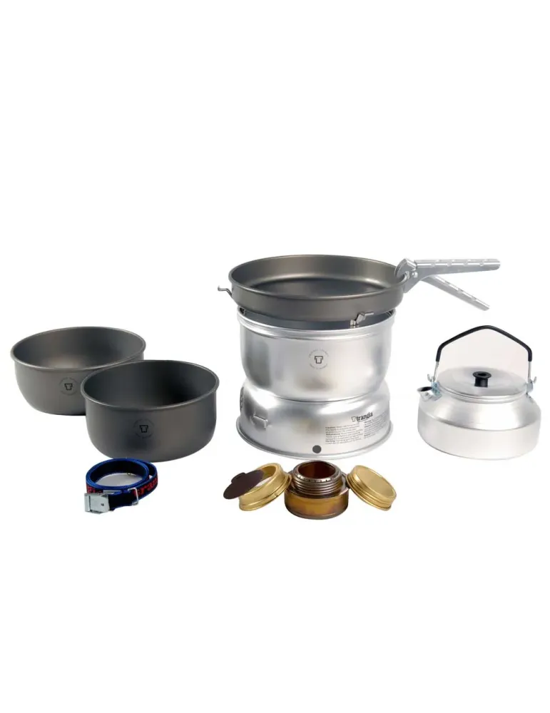 • Trangia Stormkök 25-8 består av följande: 2 vindskärmar, 2 kastruller (1,5 & 1,75 liter), 1 lock/stekpanna 22 cm, 1 kittel 0,9 liter, spritbrännare B25, grepp och rem.