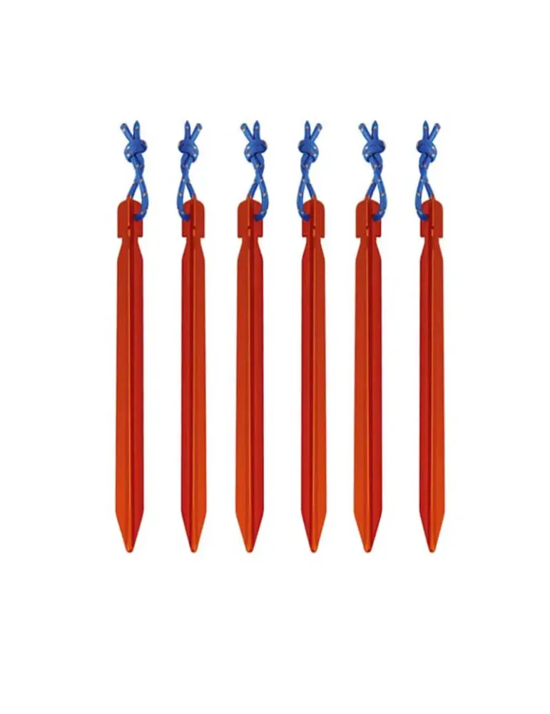 Robusta spikar för fästning av tält och annan utrustning till marken. Tillverkade av aluminium med dragsnöre i ljusa klara färger för att enkelt kunna återfinnas. Levereras i 6-pack.