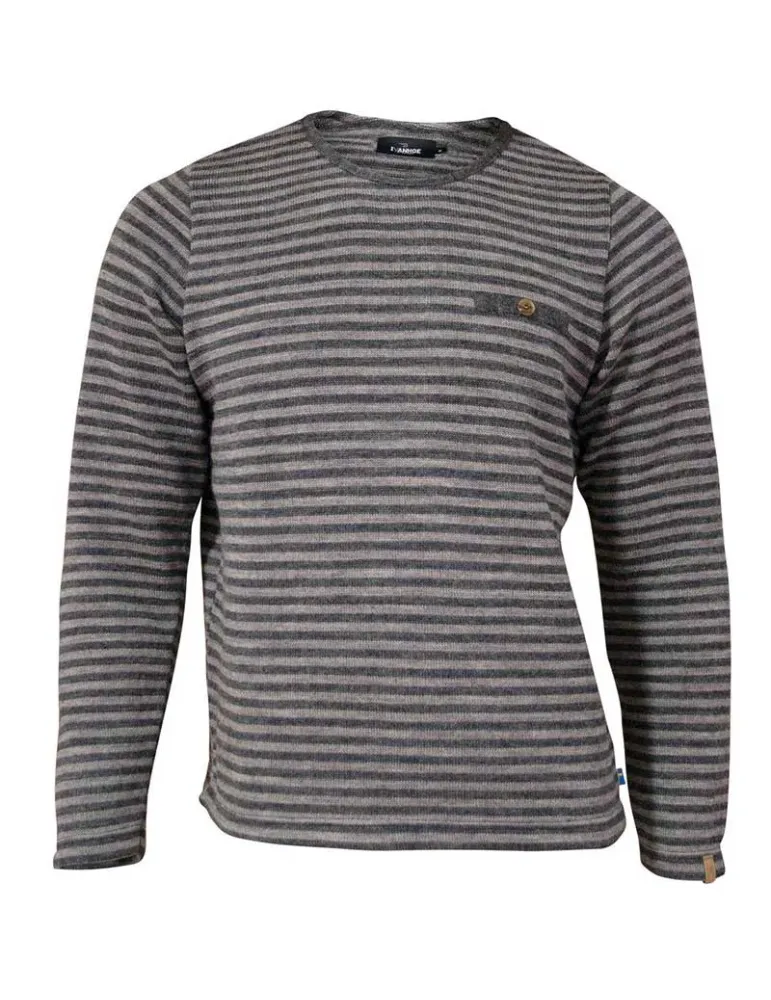 En snygg rundhalsad tröja i en lätt och bekväm ullkvalitet. Randigt material i fina och användbara färger. Dekorationsficka på vänster bröst, där knappen är gjord av återvunnet papper. Litet jacron märke nere vid vänster arm. Lika snygg vardags som till festen.