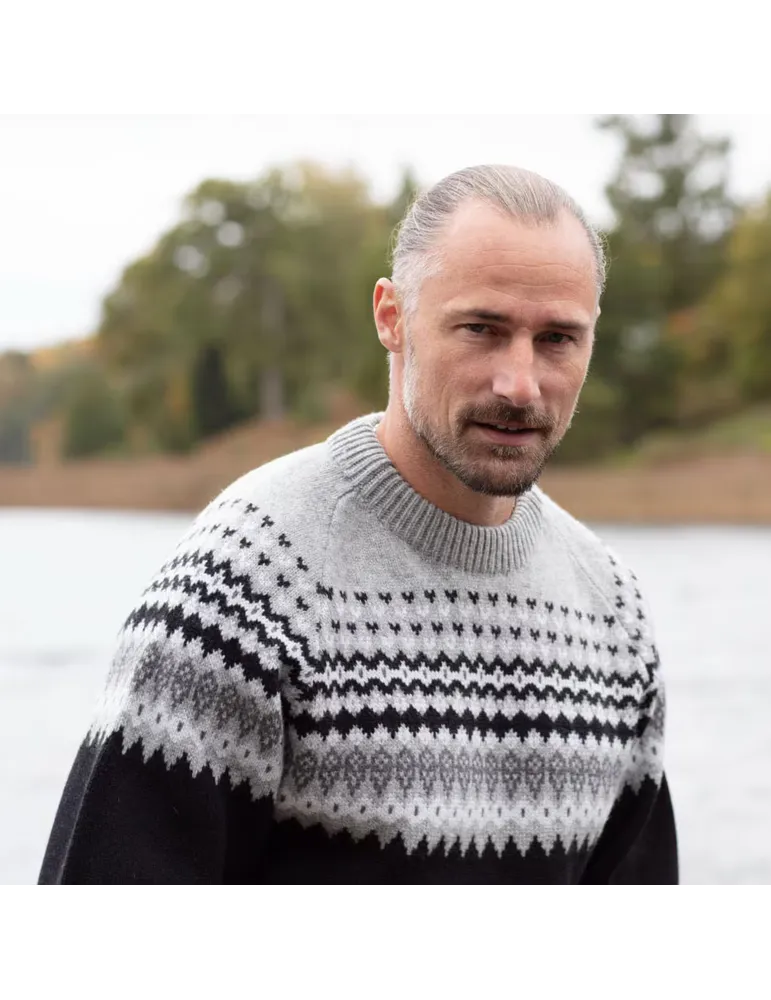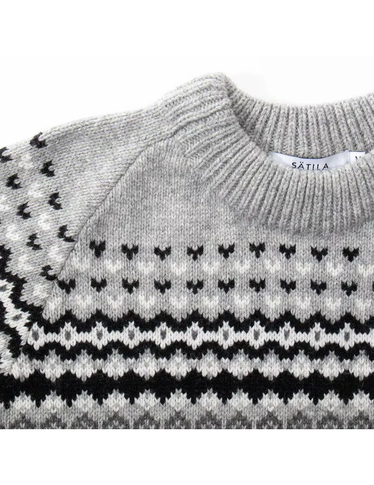 Sarek sweater är en jacquardstickad tröja i värmande lammullsmix med en rejäl känsla. Tröjan är stickad i egen fabrik i Sätila, Sverige. Det fina mönstret härstammar från Sätilas mönsterbank sedan 70-talet. Sarek sweater har en normal passform. Rygglängd ca 69 cm i storlek M. Herrstorlekar.