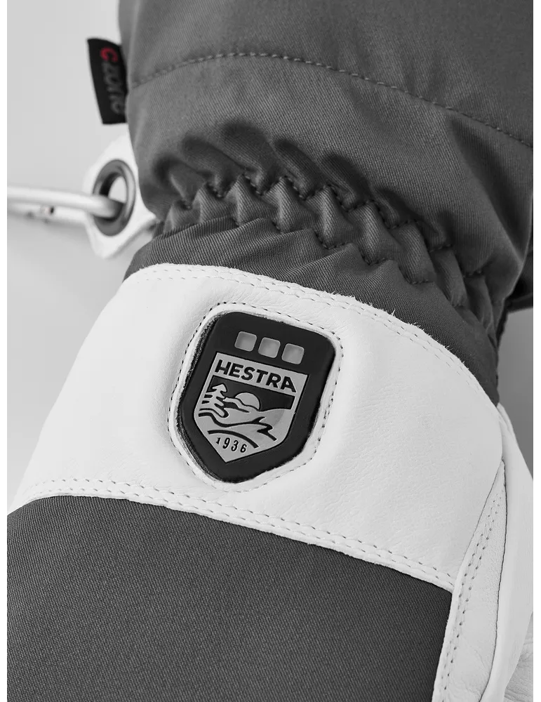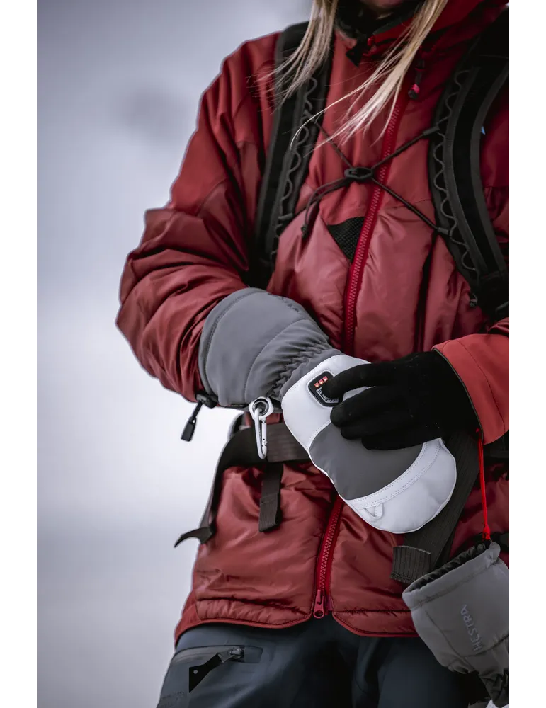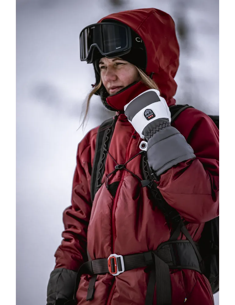 Värmen kan ställas in i tre steg och justeras efter väderlek och aktivitet. Handsken är tillverkad av slitstarkt getskinn i handflatan och ovandel i vindtätt, vattentätt och ventilerande softshelltyg. Isolering av värmande polyesterfyllning och mjukt polyesterfoder.