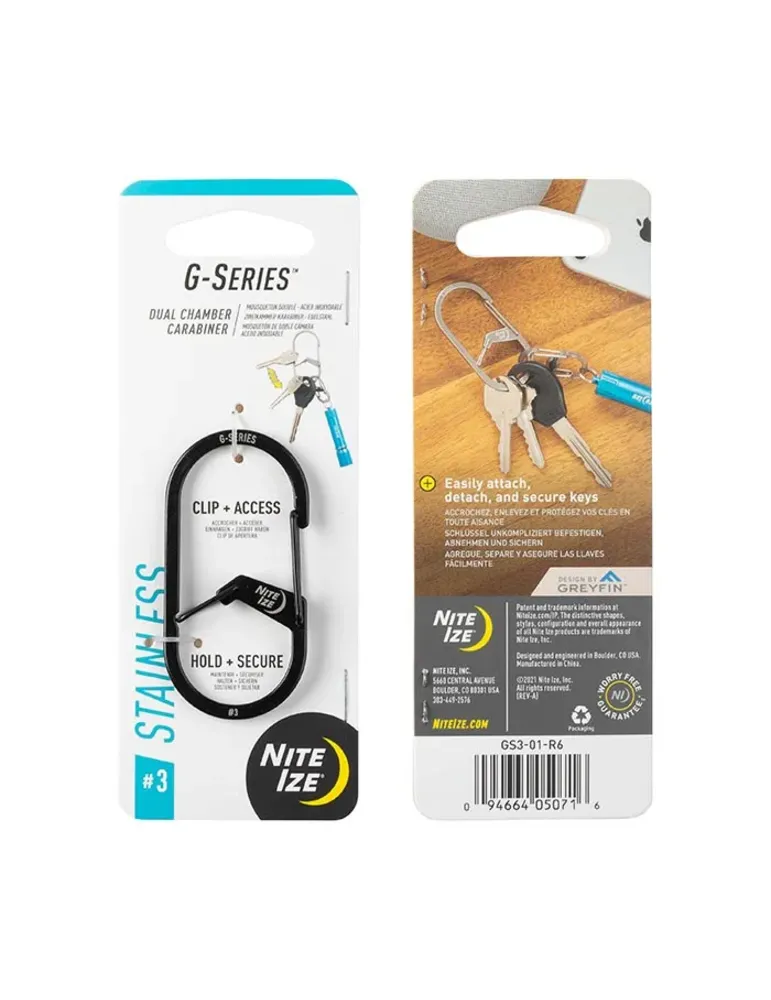 G-serien har två anslutna, men ändå distinkta kammare och är tillverkad av starkt rostfritt stål, vilket gör det enkelt att bära nycklar utan att göra avkall på säkerheten. Lägg nycklarna i karbinhakens första kammare och för dem sedan genom den inre grinden till den andra kammaren för att säkra dem. Det här tvåskiktade säkerhetssystemet gör att du enkelt kan fästa karbinhaken på bälteshällor eller väskor och byta nycklar efter behov, samtidigt som dina nycklar sitter säkert i den nedre kammaren. G-Series håller säkert fast nycklar i praktiskt taget alla utföranden, inklusive nyckelbrickor och internationella nycklar.