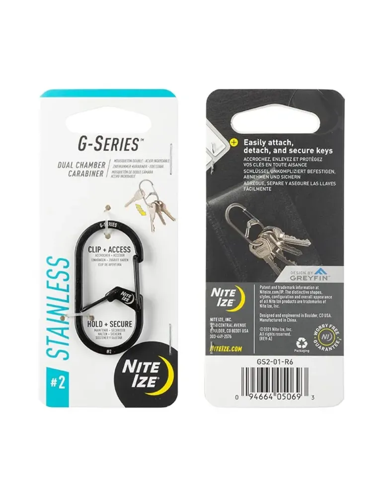 G-serien har två anslutna, men ändå distinkta kammare och är tillverkad av starkt rostfritt stål, vilket gör det enkelt att bära nycklar utan att göra avkall på säkerheten. Lägg nycklarna i karbinhakens första kammare och för dem sedan genom den inre grinden till den andra kammaren för att säkra dem. Det här tvåskiktade säkerhetssystemet gör att du enkelt kan fästa karbinhaken på bälteshällor eller väskor och byta nycklar efter behov, samtidigt som dina nycklar sitter säkert i den nedre kammaren. G-Series håller säkert fast nycklar i praktiskt taget alla utföranden, inklusive nyckelbrickor och internationella nycklar.