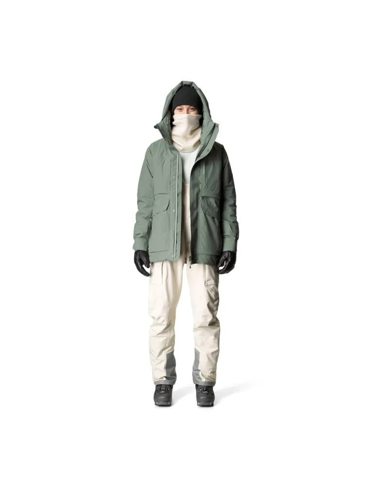 Yttertyget heter Spheric 2 layer Hardshell och är ett helt vattentätt skaltyg som håller vatten, vind, snö och allt däremellan ute. Jackans foder är Primaloft® Silver, ett lätt, varmt och mycket komprimerbart syntetiskt foder. Vi använder syntetisk padding för dess funktionsfördelar men också för att vi inte vill stjäla fågelfjädrar i onödan för att värma oss själva. Jackan har en stor huva med två justeringar och värmebarriärer kring halslinningen och nedre fållen. Du har också alla fickor som kan önskas: Två externa bröstfickor, två sidofickor, en innerficka på bröstet och en större nätficka.