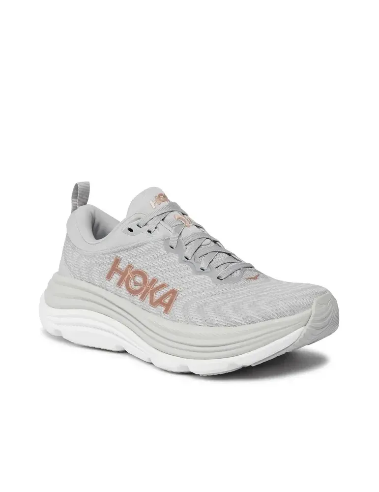 Gaviota 5 är en uppdaterad version av deras föregångare - nu med bredare läst och med ännu mjukare stötdämpning. Skorna har en ovandel i ventilerande jacquardmesh som håller foten sval genom hela löprundan. På ovansidan har de en vadderad skokrage och en vadderad plös som båda medför optimal komfort under hela användningen. Skorna är konstruerade med en H-Frame-design för bättre markkontakt och stöd under löprundan. Nytt för Gaviota 5 är att Hoka har använt sig av EVA-foam i mellansulan som ger dig mjuka steg med bra dämpning och bra respons så att du ska kunna springa långa sträckor. Yttersulan ser till att du får bra grepp på underlaget så att du kan springa med trygga steg. Skorna har ett drop på 5 mm vilket är höjdskillnaden mellan häl och tå.